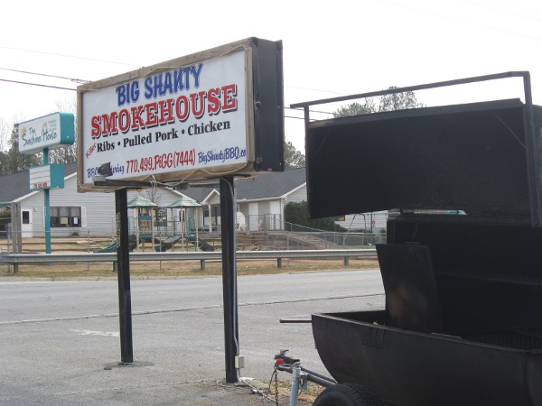 Big Shanty Smokehouse never quite managed a thirty-page thread there, but I probably would have never heard of the place if it wasn’t for that message board. I’ve never seen an ad for it, and nobody’s really raved about it at any other site that I see. It’s easily missed – I mean, who the heck wants to go west on Wade Green Road at the best of times, particularly into that ugly stretch of road where all the businesses are in repurposed houses with not a lot of parking out front, the way that side of Windy Hill near South Cobb Drive still looks? Also, you have to drive past a larger, inferior BBQ restaurant to get there. That business is large enough to give any traveler the mistaken impression that it is the cue joint they were looking for, especially when there’s nothing west of it but gas stations and repurposed houses.
