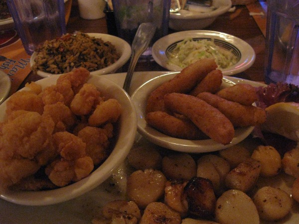 Friday evening, I was in the mood for a standard – shrimp and scallops. The Fish Market has a “lighter appetite” section on their menu, where you get about half the food for two-thirds of the price. It’s not the most economically sensible policy unless you’re just trying to save a couple of bucks, and things admittedly are a little tight. Besides, they still give you so darn much as to provide leftovers for Saturday night. So I had fried baby shrimp and grilled scallops over dirty rice with cole slaw, following some pretty good fried green tomatoes and zucchini fries that we all shared and a Greek salad. Normally, we don’t splurge on appetizers, but Karl was in town, and it’s usually very difficult for Marie and I to resist any kind of fried vegetable. Fried green beans are her particular kryptonite. I don’t know that I’ve had zucchini prepared like this before. A basket is big enough for four, and those are darn tasty.