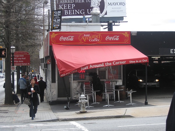 More often than not, Marie picks up a burger and fries from Just Around the Corner, a teeny little place at the intersection of Spring and Marietta. I’ve actually only set foot in the place once, so I really can’t tell you much about it. It’s got just the sort of look to it that let you know, correctly, that they’re doing something right. It’s like one step up from a hot dog cart, with only room inside for perhaps five people. And in much the same way that some of the best meals come from street vendors – I don’t know that there have ever been falafels anywhere as good as the ones that this one Turkish fellow used to serve from a little cart just below Leconte and Park Halls on the UGA campus in the mid-90s – the burgers at Just Around the Corner are just dripping with character and style.