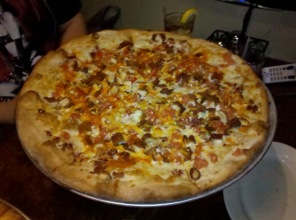 I started with a bowl of minestrone to sooth my allergy-ravaged throat, and it was excellent. I might have saved a penny or two by ordering just a small pizza and a second bowl of that wonderful soup. The pizza that the kids and I got was my son’s choice. He wanted to try the Buffalo pizza, which skips tomato sauce in favor of blue cheese and ranch, topped with chicken, bacon and tomatoes with wing sauce and blue cheese crumbles. It was very good and there was a heck of a lot of it. A large pie here will easily feed three.