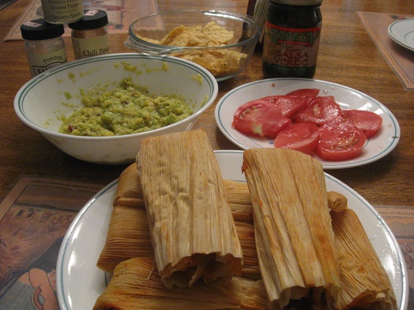After all this discussion, I hope I’m not hitting too sour a note when I say that the tamales were really just okay. We enjoyed some for supper the night that we bought them, along with some astonishingly good brandywine tomatoes and guacamole that Marie made from avocados that she bought that morning. We couldn’t quite get the tamales to heat evenly through, although the pork, spiced with adobo salsa, really was quite tasty.