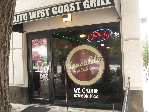 We went to Sausalito West Coast Grill, which is in midtown on Peachtree near 17th Street, sort of catty-cornered from the High Museum of Art. I’m reasonably sure that once upon a time, there was an ice cream place in this space, and on the side of the building, there was a delightful neon sign for it. Next door to Sausalito, there’s a Subway. How anybody can eat at the Subway with Sausalito sitting right next to it and still look at themselves in the mirror is a mystery to me.