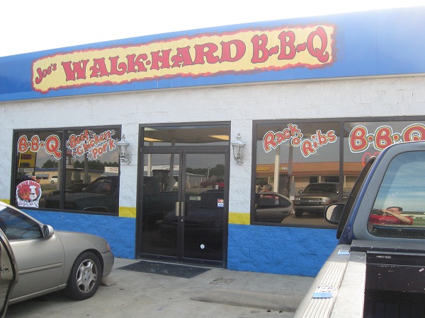 Well, anyway, we’ve been talking about barbecue, so I should probably wrap that up. The original plan had been to finish up our little tour with a visit to the town of Centre, to try a place called Starr’s Real Pit, which 3rd Degree Berns had written about in 2009. Fortunately, I learned a lesson from our trip back through middle Georgia last, as I recounted a couple of weeks ago in the chapter about our trip to Smokin Pig near Savannah, and decided to phone each of the restaurants on our itinerary and confirmed that they were all going to be open. Starr’s is now called Lanie’s, and they are not open on Saturdays. That left me fumbling a bit, as Urbanspoon was not able to find another barbecue place between Fort Payne and Rome. That’s because, as mentioned in that chapter, the site is called Urbanspoon and not Barbecuerestaurantsinthemiddleofnowherespoon. Google was able to find a restaurant in the area that nobody had submitted to Urbanspoon yet. I phoned Joe’s Walk Hard in Leesburg, a small town between Collinsville and Centre, and confirmed that they’re open for business.