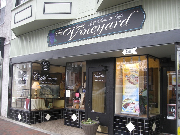 The food options are mainly either light snacks like the tiny but very tasty bowls of soup, a certain prize-winning croissant sandwich, and desserts. I would definitely like to revisit this place when the dessert menu is back on my options list, as I could sit with a friend talking about books over many, many cups of tea and slices of cake or croissants. My soup and salad were excellent – I wonder where they got such good tomatoes in the winter, and the dressing was interesting too – but a slice of cheesecake would definitely have set off my tea more effectively. The Vineyard Café seems to have parties, bridal showers, and such as a significant portion of their business, but I would have to say that if I had time to be in a book club I’d vote for this as one of the main destinations.