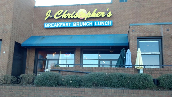 This is Marie, contributing an article about breakfast. Recently, my brother came for a visit. He is more of a hearty eater than I am. For one thing, he likes bacon. Although we have a number of excellent breakfast places, my current dietary limitations mean it’s not quite as much fun to go to places like the delightful Stilesboro Biscuits. On his first day here, we went to a national chain restaurant. I decided that for his second day here that an alternate had to be found. Which is ironic, because we wound up going to a chain after all – the difference being that it was a local chain that started right here in Marietta. Karl suggested J. Christopher’s, and I am glad he pointed it out because otherwise I might not have known it was that local. They currently have 22 stores in Georgia and Tennessee.