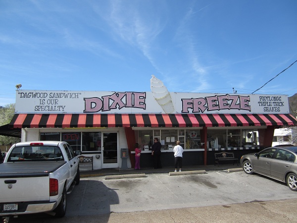 Anybody who has traveled between Chattanooga and Nashville has seen the beautiful reservoir of Nickajack Lake. The view south of the interstate is breathtaking and unspoiled, but the view north shows off a fabulous old steel span bridge. I’ve always wanted to drive across that, but getting to Nashville as quickly as possible has always been the goal. That wasn’t the case this time. I was pleased to see that US-41 is the road that takes that bridge. So the plan was to take I-75 to Chattanooga, and I-24 to the other side of town, exit 174, and then follow 41 alongside the Tennessee River, cross that bridge and go to Jasper. From there, it’s a six mile hop down US-72 to the town of South Pittsburg. A roadfooding acquaintance of mine who writes the blog Davwud’s Food Court had written lovingly about a classic restaurant called Dixie Freeze before, and that looked like a great destination.
