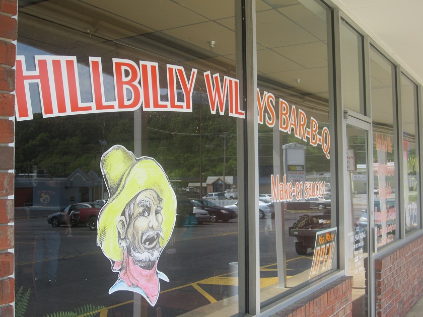 Hillbilly Willy’s was already several years old before I discovered them. George Foster started his business in a tiny little shack in Ooltewah, on the other side of Chattanooga from his present location, about eleven years ago, doing carry-out and catering. Around the same time that he was growing and thriving and looking for a larger space, I was stopping at a Bi-Lo just off I-24 on my way to Nashville for occasional twelve-packs of Double Cola. In time, the Bi-Lo closed, the shopping center’s owners lowered the rent on the smaller spaces to attract business to the mall as it lacked an anchor, and Foster moved in, setting up billboards letting people know about his great barbecue on the west side of town.