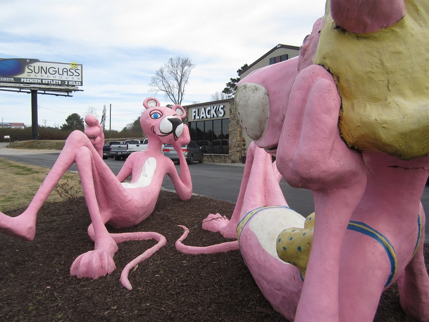 Cherokee Music closed in 2011. I found a phone number and called it anyway. The former owner told me they sold off all the statues, but some of the Pink Panthers were still alongside GA-400. I found that a business called Flack’s Flooring picked up two and they’re still there, enjoying a romantic picnic.