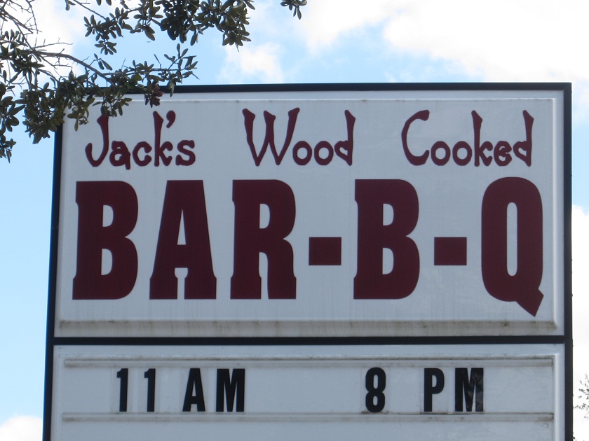 It didn’t occur to me for several days, but by stopping at this little place, we’re one away from a set of barbecue joints in the four corners of Georgia. Eighteen months ago, we visited Mountain Man in the northeast corner, almost in North Carolina. In the fall, we went to Thatcher’s in Trenton, from which a brisk walk would soon take you to either Tennessee or Alabama. And now we’re on I-95’s southernmost Georgia exit. Going east would take you to St. Mary’s before finding the salt marshes, but there does not appear to be a barbecue restaurant in that town. A quick hop west, however, sees Jack’s BBQ, which, since 2007, has been located in a rustic building across the street from a big truck stop.