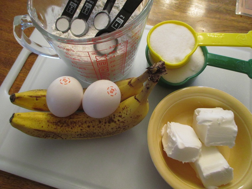 The dry ingredients I blend with a fork into my large Pyrex measuring cup. Make sure they are well blended so the baking soda doesn’t fizz when it touches the wet ingredients. Blend the eggs, sugar and Crisco together in whatever order suits your fancy, but they should be thoroughly creamed, and bananas should be last. You can either put the fruit in before or after starting to mix in the flour mixture, as that is added in stages, but the texture of the final product will differ slightly depending on which way you do it so try both ways before settling on one. In this case, I mixed the dry ingredients into the wet in three stages, ending with bananas. It’s best to break up the bananas into chunks and roughly mash them before mixing them in; try for a chunky paste that doesn’t have big enough pieces that you risk bits sticking to the side of the pan, as the chunks will pull out of the baked loaf when you remove it. But I like some texture; if you don’t, mix in the bananas thoroughly with the wet ingredients before adding flour. Make sure you don’t add too many bananas, as that will result in a wet center of the loaf that collapses on itself partway through baking, even using small pans the way I did in the image. If you have small to medium size fruit you may need to eat a chunk or two instead of mixing it in. This recipe works best in small to medium sized pans.
