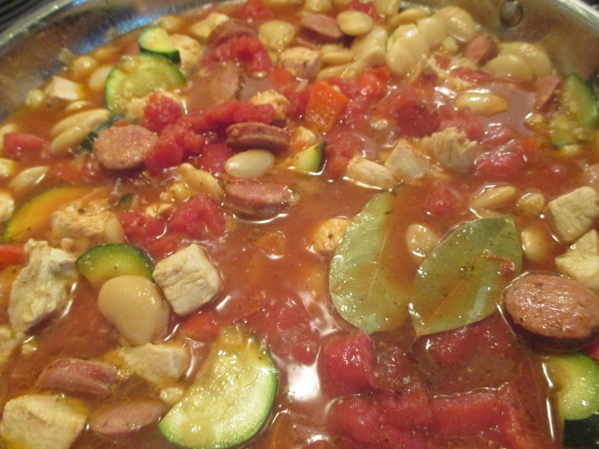 If serving with rice start that first. Otherwise, start by softening the onion in the olive oil over medium-high heat; when slightly translucent, add garlic and chorizo. Brown the sausage slices, watching to be sure the garlic doesn’t burn, then add and brown the chicken chunks, about another 3-5 minutes, then add the red pepper chunks, chili flakes and paprika. add the chicken stock; vigorously scrape the bottom of the pan to get all the nice chorizo and chicken bits up, then add the tomatoes, beans, and bay leaves. Simmer uncovered, stirring occasionally, for 15-20 minutes or until desired consistency. While sauce is cooking down, start a pot of noodles if you preferred those to the rice option. If the sauce starts cooking too vigorously, turn down to medium. Stir occasionally and be sure to discard bay leaves before serving.