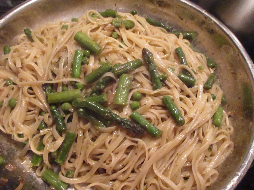 The original recipe called for spinach fettuccine, but I hadn’t any on hand and my usual grocery store doesn’t stock it, but the recipe is very good with regular fettuccine too, so just try it with whatever you have on hand. I will of course have to try it again soon with the correct variety of noodle, or perhaps use some garlic or olive or other flavored type just for fun. The only really essential parts are of course the pasta, the asparagus (make sure it’s fresh and that the hard ends, if present, have been trimmed off) and and a decent quality pesto. Or, of course, if you want you can put in basil and oil and all the other things that go into pesto, if you prefer to do the complete-from-scratch route. I am sure yours would be totally amazing that way. Make sure to invite me over to check.