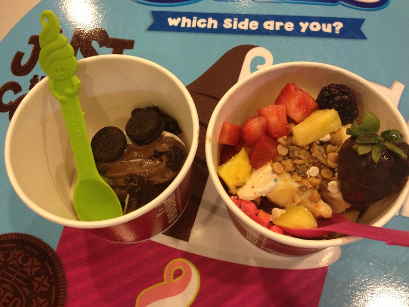 This is Marie, contributing an article about froyo. Actually, I brought along our froyo expert, the teenager. She likes froyo more than anybody else and makes “Ooooh, shiny” type noises every time we pass any froyo place. However, as our regular readers are aware, I am the serious dessert fiend of the family, but I have an abusive relationship with dairy. I am, regrettably, lactose intolerant. While of course (of COURSE!) I prefer the high-butterfat, extremely creamy, hard-as-a-brick-when-cold type of ice cream, the active cultures in frozen yogurt mean I can have a bowl without it hating me back. Nevertheless I took it easy.