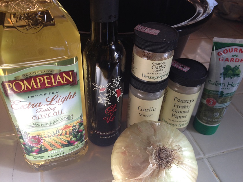 Combine the dry ingredients and rub them on the chicken. Pour olive oil and garlic on the bottom of the crock pot (I added the diced onion there too). Place chicken on top. Pour balsamic over the chicken. cover and cook on high for 4 hours. garnish with cilantro or parsley, if desired.