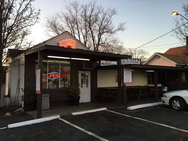 My daughter was unfamiliar with North Carolina barbecue, and she never really warmed to it on the trip. She never said that she disliked any that she tried, and she picked Lexington’s as her favorite of the eight stops there, but this was more her measure, and consequently the meal she enjoyed most over the two days. The meat at Mike & Jeff’s, which is smoked over hickory and oak and served dry, with sweet and mustard sauces on the side, is a little more like what you might find in Memphis. The pork is pulled, and not chopped too finely. It’s quite smoky, and dry enough to require a little sauce to give it the right flavor. The kid prefers a thick, sweet sauce like this to the vinegar-based ones we’d seen at the previous eight stops.