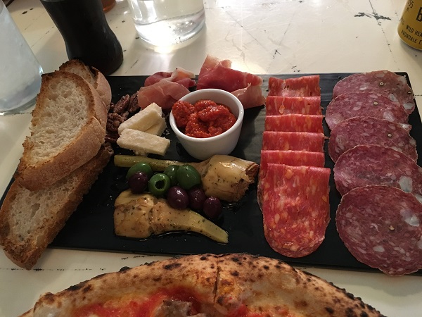 Marie and I ordered a Maradona pie, leaving off the peppers on account of our fussy four-year old, and a meat and cheese plate which turned out to have rather more olives than cheese. The olives were great, but I’d rather have had some more cheese than that. The meats were quite good, although everybody except me agreed that the soppressata was surprisingly spicy. I thought it was kind of mild, myself.