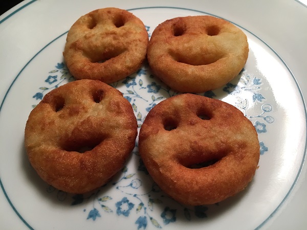 Peel, cube, and boil the potatoes. Mash with egg, corn starch, flour, salt & pepper, and breadcrumbs (add no liquid). Set aside more flour for rolling. Roll dough between floured sheets of parchment paper to about 1/4 inch thickness, and chill. While it’s chilling, get a wide, deep pan or skillet and put in the oil. Cut like cookies and lay them on another sheet of parchment paper. Cut out eyes with a straw, and make the smiles by pressing a small spoon into the dough and roll it around a bit. I found it most effective to pick up each round and place it so the smile was lined up with the gap between two fingers, so the spoon would go all the way through the dough and open up the smiley mouth. Make sure the oil is hot but not super hot – the recipe calls for 350 degrees.