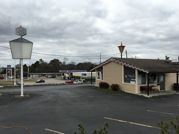 Above, the restaurant as it appears today, and, below it, its original home in the building next door. Glenn, who has passed ownership of the restaurant down to his daughter Connie Ward, couldn’t remember what the building had originally been constructed for beyond it being an ice cream shop. He didn’t think it had been a Tastee-Freez. I’m not half the expert I’d like to be; do any of you recognize that shape of sign, or the rooftop spire?