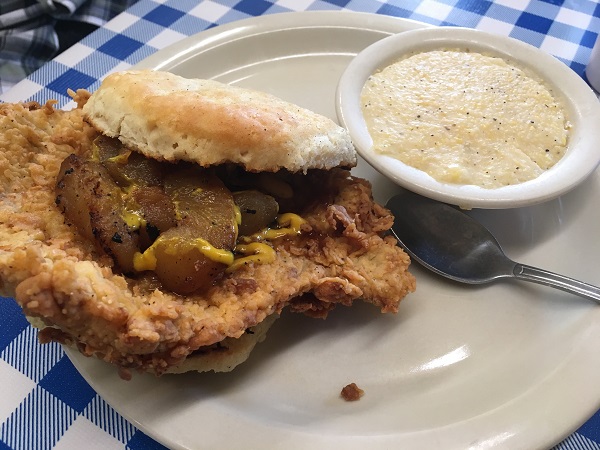 He’s a good fellow, Rex. He let me carve off a nice chunk of his tenderloin to sample. The hot chicken is mighty good – and these biscuits are just fantastic – but this pork tenderloin is just outrageous.