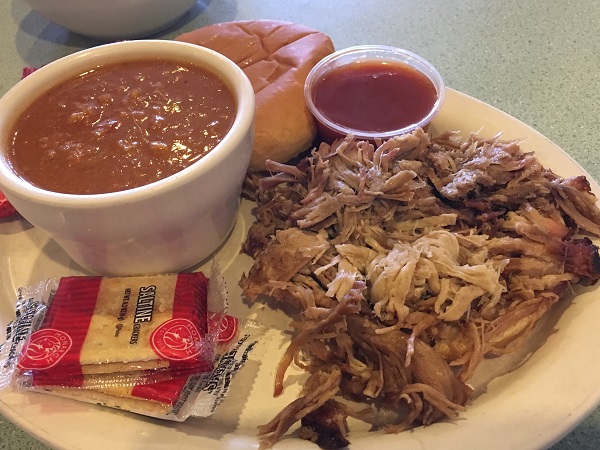 We arrived after the Friday lunch rush wiped them out and before the kitchen could start getting dinner together. This is a popular place! Marie figured on a small banana pudding, but they were out. She asked for potato salad and was stymied again. Our server seemed to be a little new to the job, since each of these stumbles had to be uncovered on separate trips to the kitchen, rather than getting a definitive answer on what they could provide. Marie settled on a slice of pie. Our server went back to check yet again and returned with thumbs up.