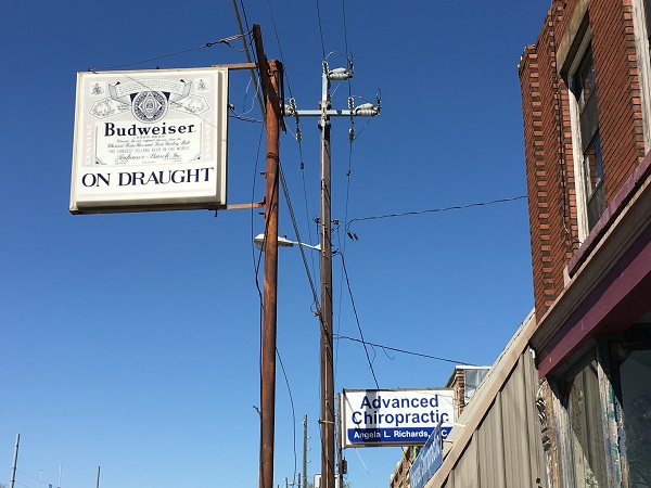 They smoke the meat outside the building using a small smoker and a big stack of hickory wood. It certainly smells terrific. After our short visit, which included my attempts to get a little local history or technique from our incredibly sweet server but receiving instead long stories about her church and children – there are probably many, many reasons why nobody from the Southern Foodways Alliance ever phones me, but my rather pathetic attempts to start a conversation about food and keep it on topic must surely be among them – we paid our bill and walked across the street to look around a little, especially as an old Budweiser sign caught my eye.