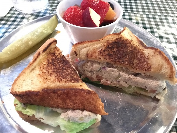Grant decided to go veggie and had the “Slammin Veggie Hoagie,” which he enjoyed. The girlchild’s eyes lit up on seeing the pizza offerings, and as she had declined lunch entirely she got to have her own personal pizza, which she found satisfactory; it smelled wonderful. I dithered terribly and eventually settled on the chicken salad sandwich, which was quite tasty and I was able to exceed my expectations for how much I could eat of it (though a very small voice in my head mentioned that it would have been even better with apples and grapes, but that’s just me being spoiled by Chicken Salad Chick).