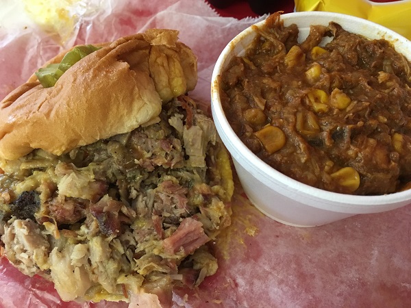 Chester’s was clearly having a bad day, but these things happen, and I try to live up to a credo: Open mind, kind heart. The food, as it turned out, was delicious and worth the short wait. The pork sandwich comes with a little of the mustard sauce that’s common in the area, and the stew is completely awesome, really thick and full of meat and corn. By the time I finished sampling my sandwich and stew, the crowd had departed almost completely, and Cheryl and I went over to the library to join my family, and she drove us to Iron Bank Coffee on 11th Street so we could all sit and talk for a while, and have the conversation that we might have had, if Chester’s had room inside for dining rather than just stools along the windows!