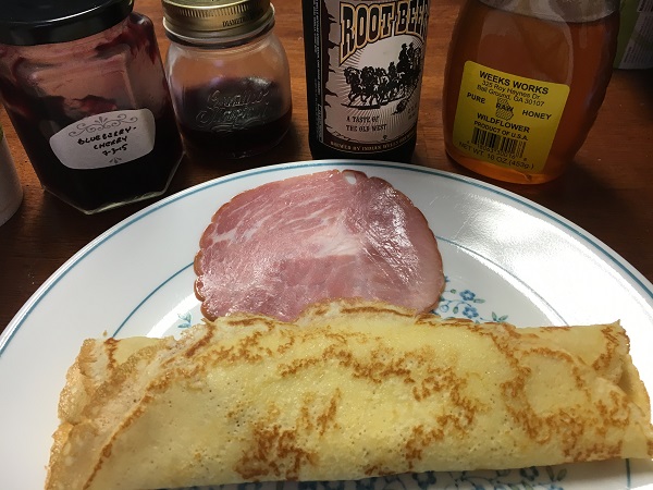 My family likes pancakes and crepes, but we rarely do breakfast together so it really isn’t worthwhile to go to the effort very often. However, this recipe makes only about 6 crepes, so it’s easily consumed by two people, even if one of them is a 5-year-old with a hollow leg. I doubled it when making it for all four of us and it turned out nicely with a couple left over at the end as insurance in case there had been any spoilage.