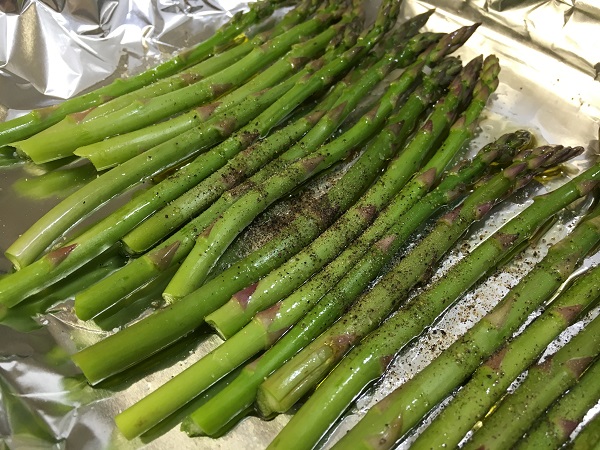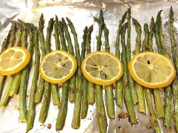 Cooking the asparagus is easy. Just snap the stems, sprinkle with olive oil, pepper and salt, and lay lemon slices over them, then bake. I’m still getting used to the oven at my new place and it runs hot, so my asparagus wound up a little more done than I’d have preferred even though I pushed the heat down to 375. After pulling the asparagus out of the oven, cut it into about thirds, or bite size.