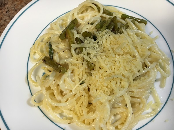I suppose if you do each step individually instead of trying to get it all done in a timely manner, Scott could have accomplished the task. But I had no desire for cold asparagus, or for the milk sauce to develop a skin while I boiled pasta separately.