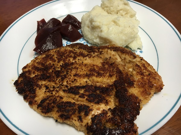 “Those are chicken breasts pounded flat and coated with cornbread crumbs,” I said. “And flavored with rosemary.”