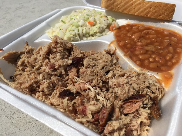 My son decided that he wanted a baked potato, and they apologized for not having any immediately available, but they’d get one started if we could wait a few minutes. We took the rest of our food as it came out and enjoyed it at the building’s picnic table, enjoying the shade while we could as the sun crept behind the trailer and, inch by inch, we lost the shadow. I had beans and slaw with my plate and they were nothing to rave about, and Marie had a sandwich. We both thought the pork was about average for this region. It was smoky, and needed just a little sauce.