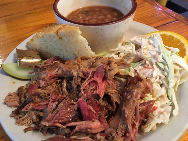 Marie and I each had the same thing, a pork platter with beans and slaw. They do offer smoked trout and salmon as well, which in retrospect I think that I would have liked to have tried, but we were not being very sensible. As I’m typing this, I’m wondering about the smoked trout BLT that a fellow sitting next to us ordered. The pork is very good, and proved to be among Marie’s favorites of the ten barbecue places we visited on this trip.