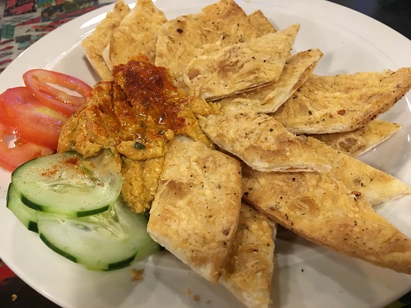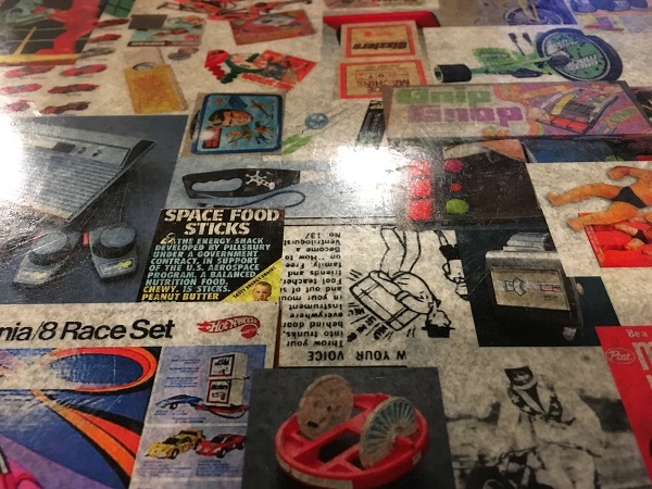 Georgia was eking out a win over Auburn as we took a table. Like the decor at Aretha Frankenstein’s, this is a place in love with the past. Our table had a centerpiece collage of old stuff, mainly toys and lunchboxes from my childhood: Steve Austin dolls, spacehoppers, and Gnip Gnop. Pretty soon, this got covered with a hummus appetizer, served with pizza crust chips.