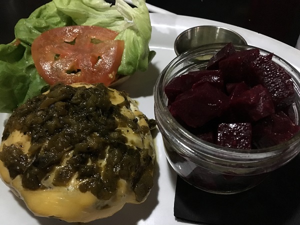And then, our burgers came out. I ordered the New Mexico green chile burger and didn’t remember until it was delivered that was what I had last time. Oh, well! It’s a really good burger and I was glad to have it again, even with the same side of lightly pickled beets. These are much less pungent than the appetizer that I’d ordered. Everybody else was happy with their picks. Kelley had a chicken sandwich, Matt had one with guacamole, and Darius ordered the Asian Q, which is made with Wagyu beef, wasabi slaw, ginger barbecue sauce, and cucumber kimchee.