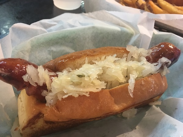 Marie ordered a kielbasa with kraut. The dogs here are served on New England-style split buns. She was really pleased with it.