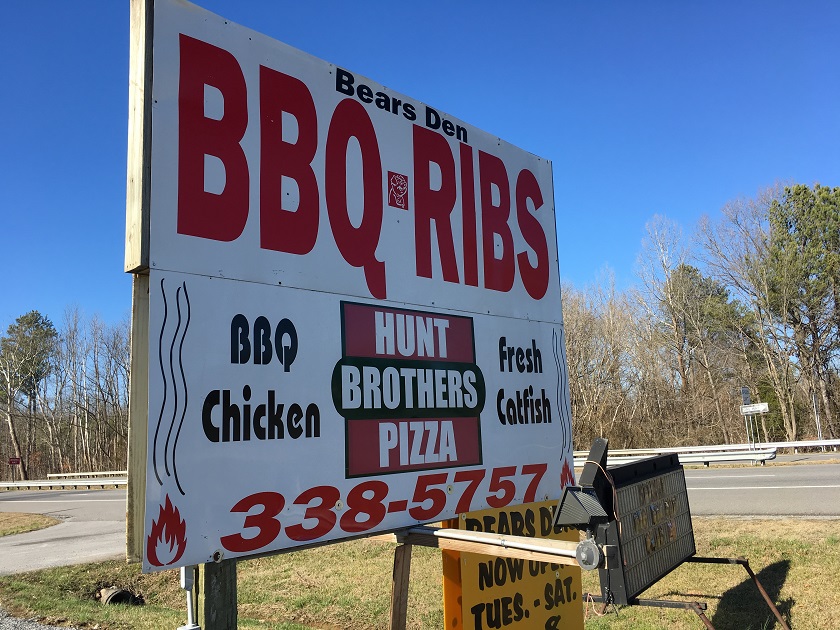 We were surprised by one note of our meals. In a region where almost all the barbecue is prepared and served the same way, Bears Den is the first place that we’ve visited in ages to keep the meat simmering in a little sauce in a steam tray. You see this in several places in South Carolina, where it’s a mustard-based sauce, or in middle Georgia around Macon, where a different style of mustard-vinegar is used. Simmering in a sticky-sweet tomato-based sauce is pretty uncommon. Troy’s in Rome GA does something similar to this, and so does Herb’s in Murphy NC.