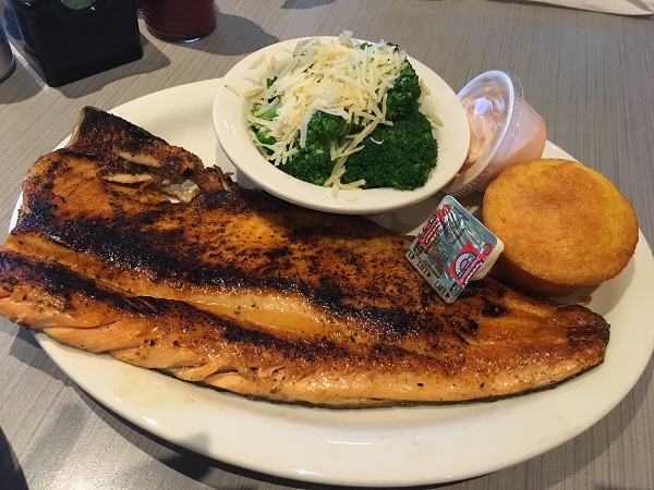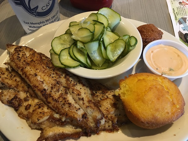 Marie and Karl each ordered trout and were very happy with them. She got the rainbow trout, and he picked red trout, which was a special that evening. I took a break from my usual rule about seafood restaurants there. The daily specials will often be much tastier than what’s on the regular menu. The restaurant is known for its catfish, and so that’s what I ordered. Our server recommended that we order our entrees lightly blackened rather than fried.