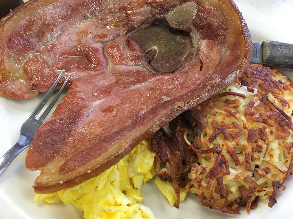 I maybe have meat with breakfast about once a month. For somebody who enjoys barbecue and hot dogs as much as I do, it’s unlikely that I could ever go fully vegetarian, but we do observe meatless Monday just because we’d like to be a little healthier, and this has extended into my choices at, say, Thai restaurants, where I’ll probably order tofu instead of chicken or pork. I’ve been thinking about my meals that way for so long that having country ham at breakfast seems very strange these days. Then I got this absolutely gigantic slab of it. Good grief, even when I was eating like an unhealthy twenty-two year-old every single day, that’s a huge amount of meat on the plate.