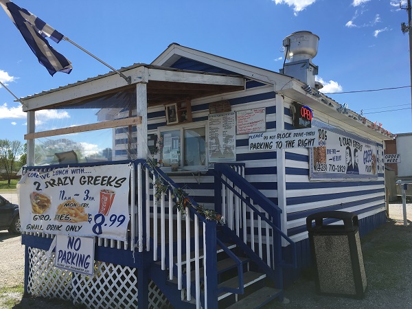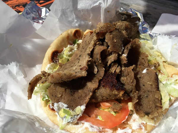 I even love this place so much that I didn’t mind wearing their food the first time that I visited. That first stop, I had the gyro platter, and I don’t remember the last time I enjoyed gyro meat this much. Probably Nick’s in Atlanta. It was completely delicious, and I had it with a Greek salad rather than potatoes. You can see it in the picture above, noticing that I’d placed some triangles of pita bread inside the cover of the tray while I enjoyed my lunch at one of the two picnic tables in front of the building. Well, the wind started raging as I ate, and three triangles weren’t enough to hold it open. As the gale force grew, my knife and fork vanished, my book flew off the table, the triangles went airborne and the bread whished through tzatziki sauce in one compartment and dressed lettuce and feta in the other and smacked me in the chest. I turned my back to the howl, cleaned myself off, retrieved my book, and walked back up to the window. “May I have another knife and fork?” I asked. “A tornado claimed the others.” I ate the rest of this wonderful meal in my tiny little car.