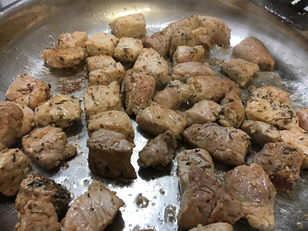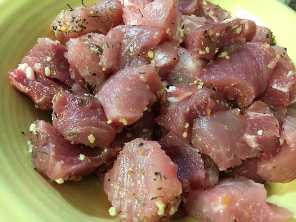 2) Cut pork into medallions/cubes and coat with seasoning