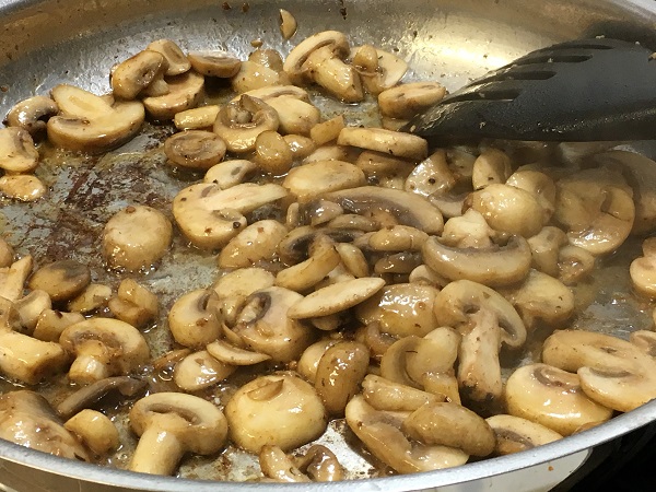 6) Place remaining butter, thyme, garlic, and mushrooms in the pan and saute until tender, about 3-4 minutes. Microwave the refrigerated potatoes if you didn’t start peeled potatoes in boiling water 15-20 minutes ago already.