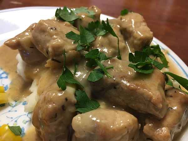 7) Reduce heat to medium-low, stir in broth and pork, simmer 3-4 minutes until sauce has thickened (you can be mashing your real potatoes during this time if you like) and check pork for doneness (thermometer will read 145, or you can just cut the biggest chunk in half and check the color of the middle. I’m reckless that way.)