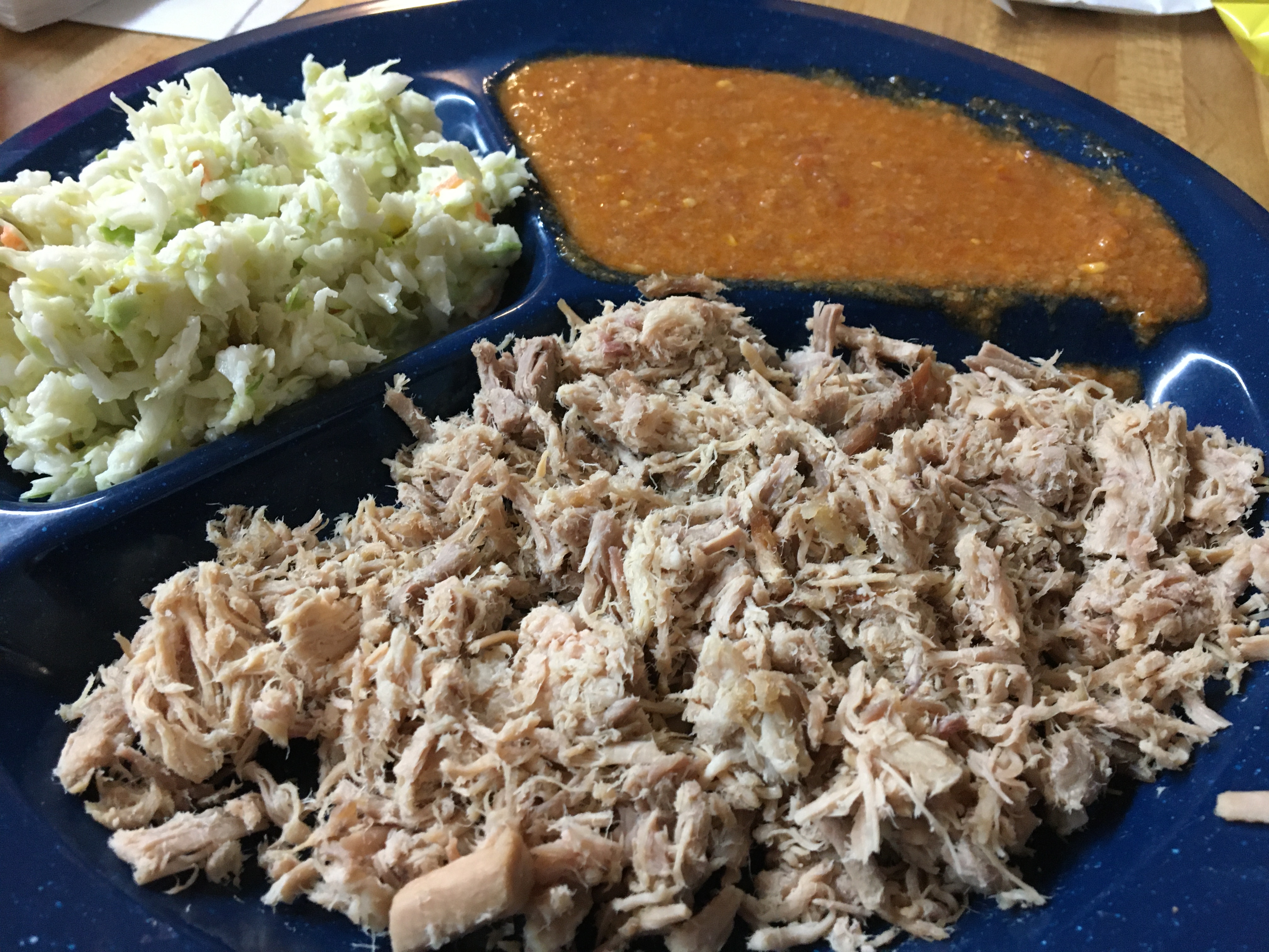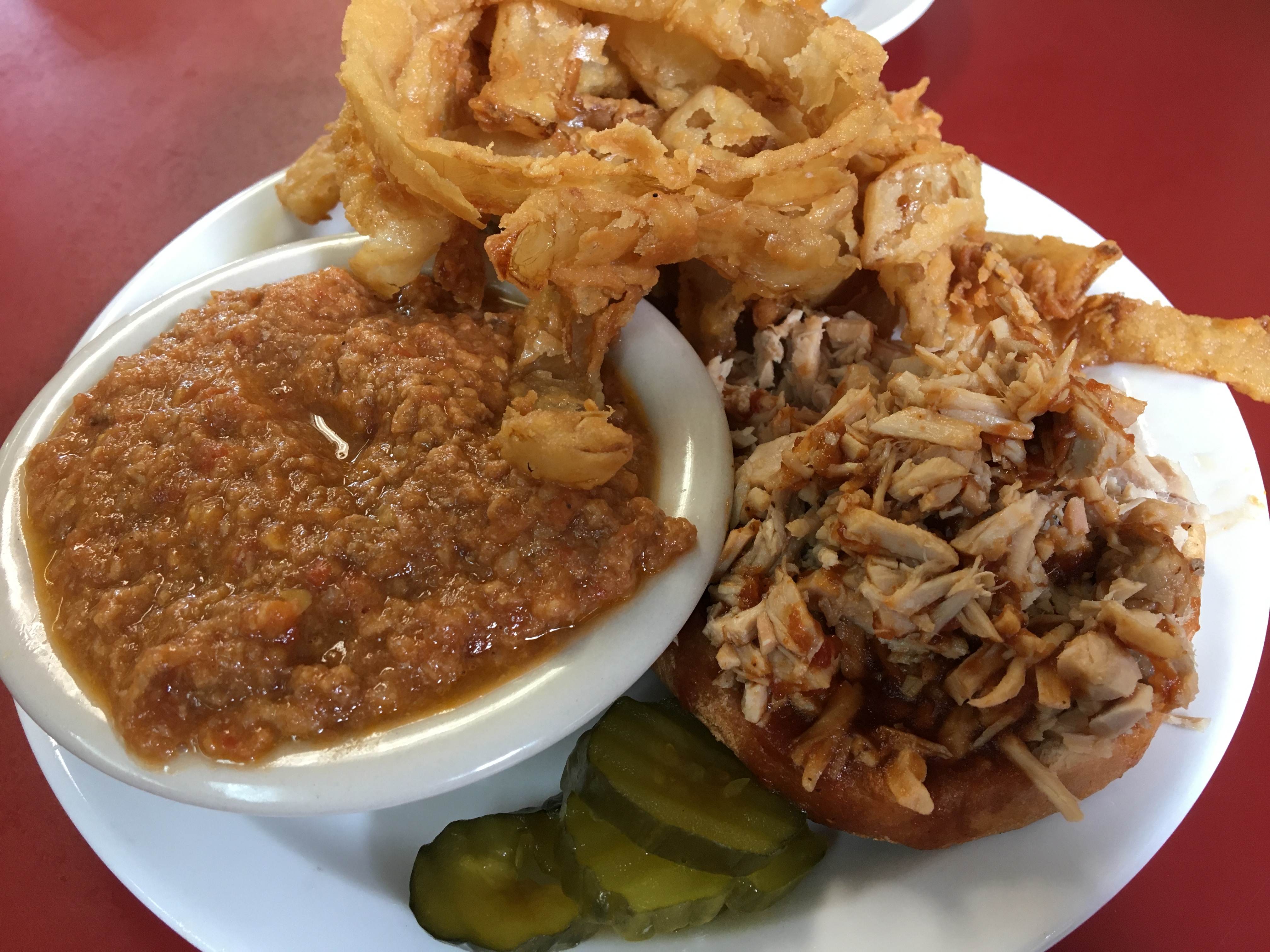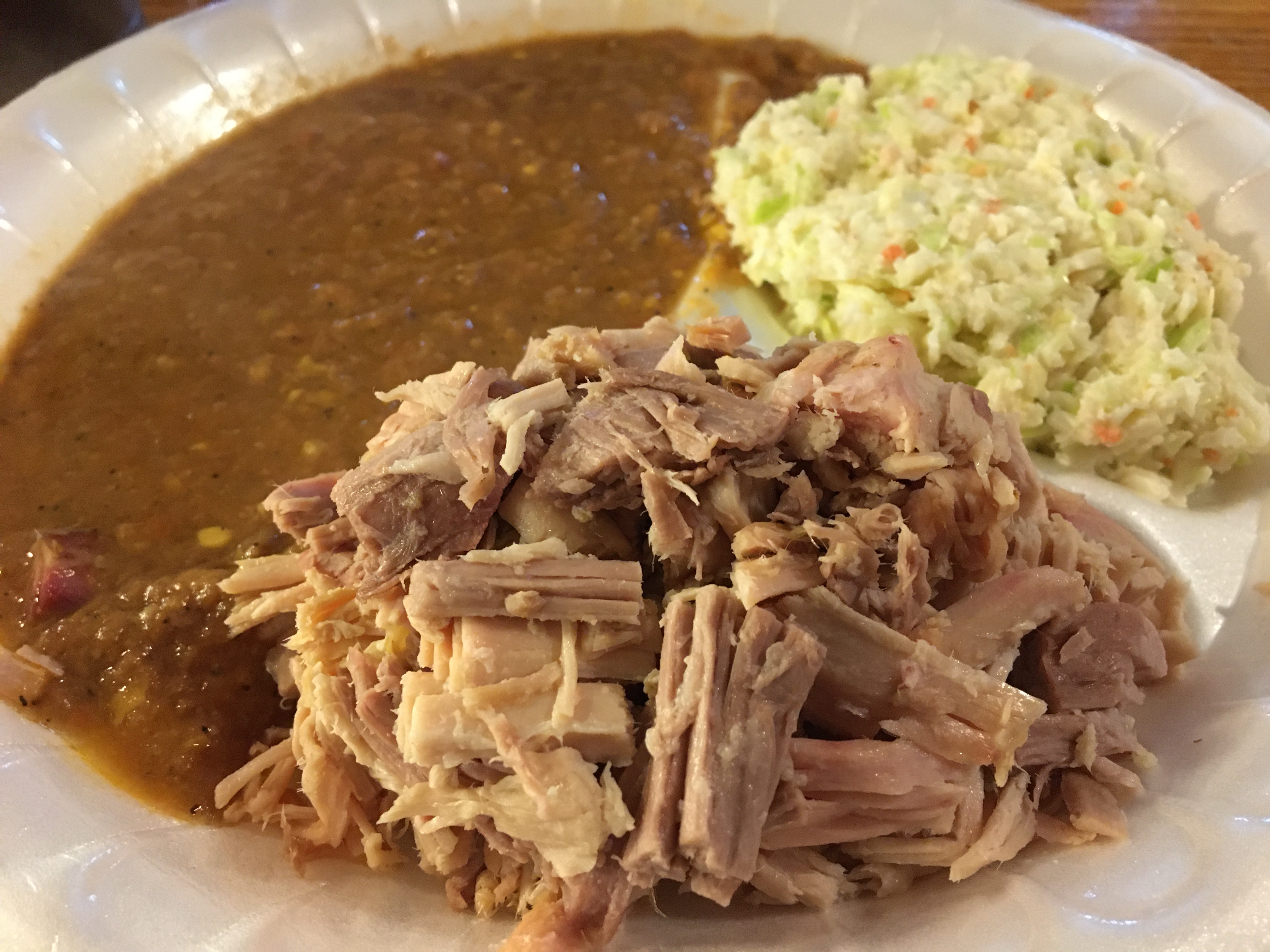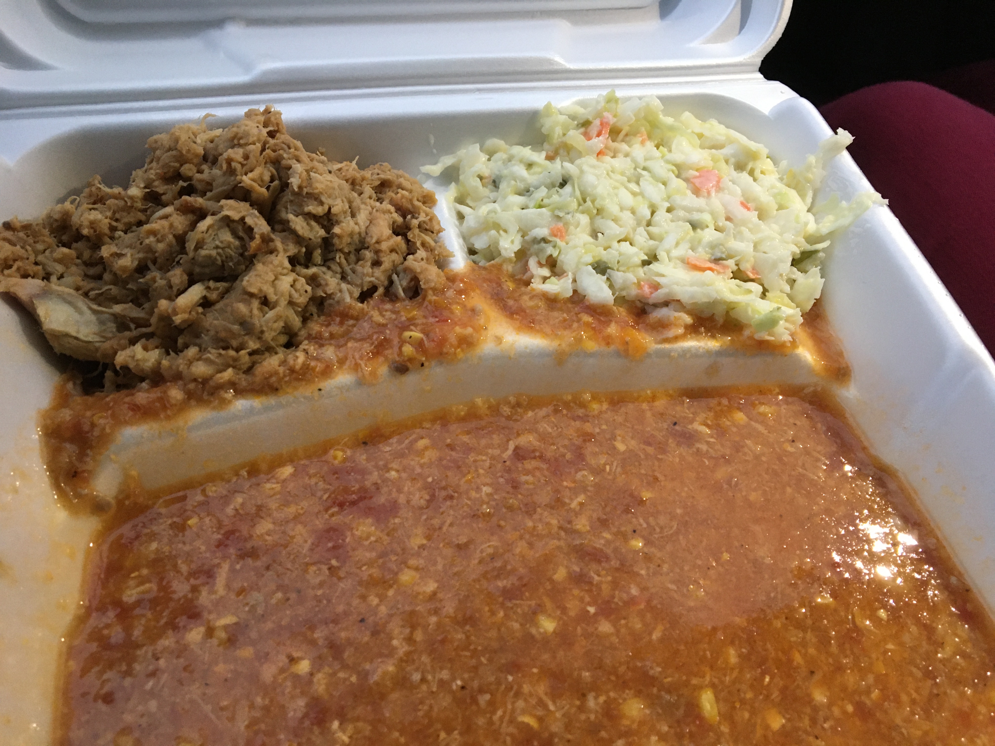 My family waited patiently for me, and then we drove into Athens for them to eat. The Butt Hutt is the newest restaurant we visited, about twelve years young, and it’s grown into a standard sit-down place with lots of servers, multiple sauces for different tastes, and a liquor license. The pork here is good, a little dry but smoky, but the star is chicken mull, which a few restaurants – not many! – in this region offer as a side. Hot Thomas had been one, unfortunately.