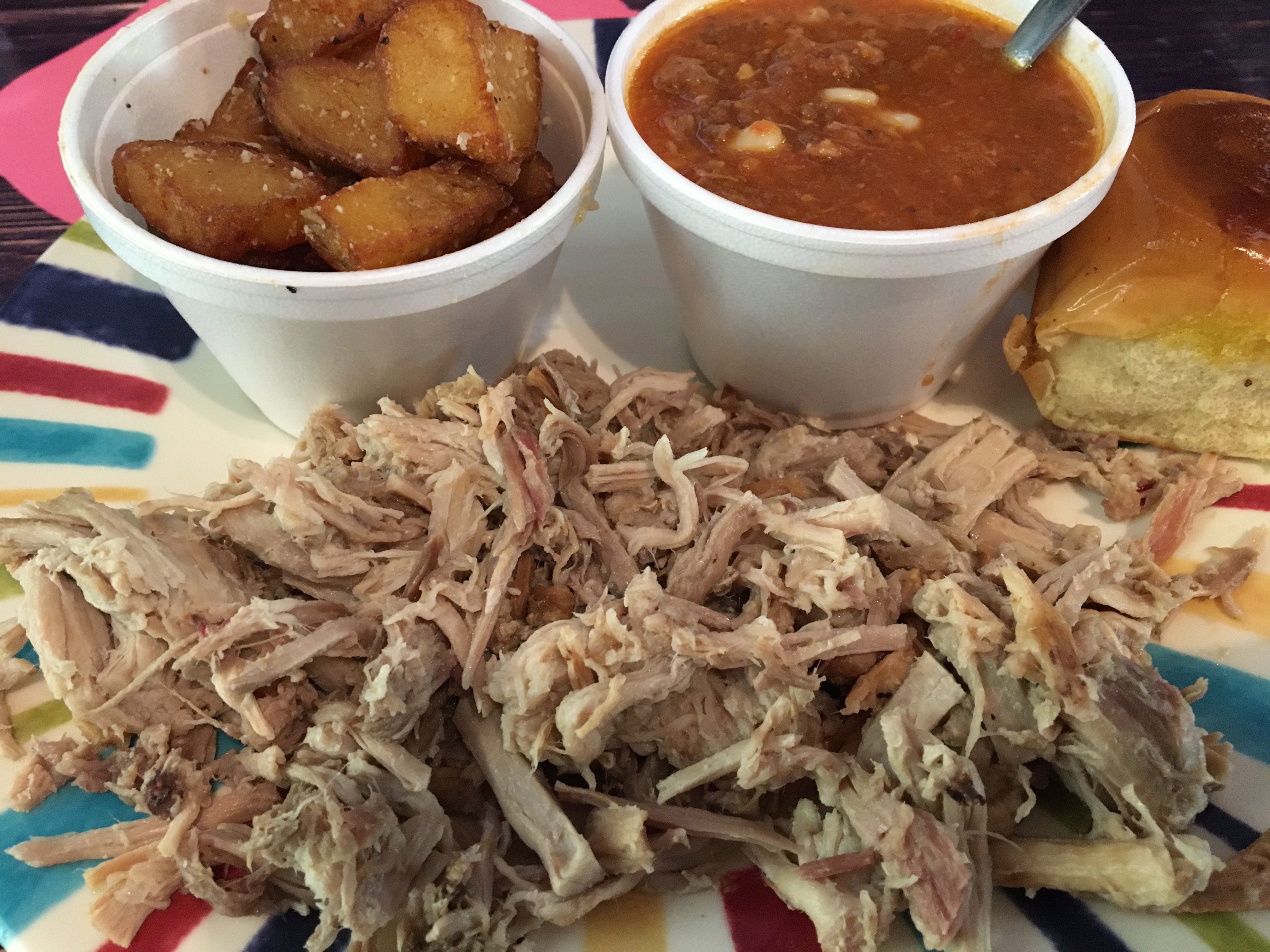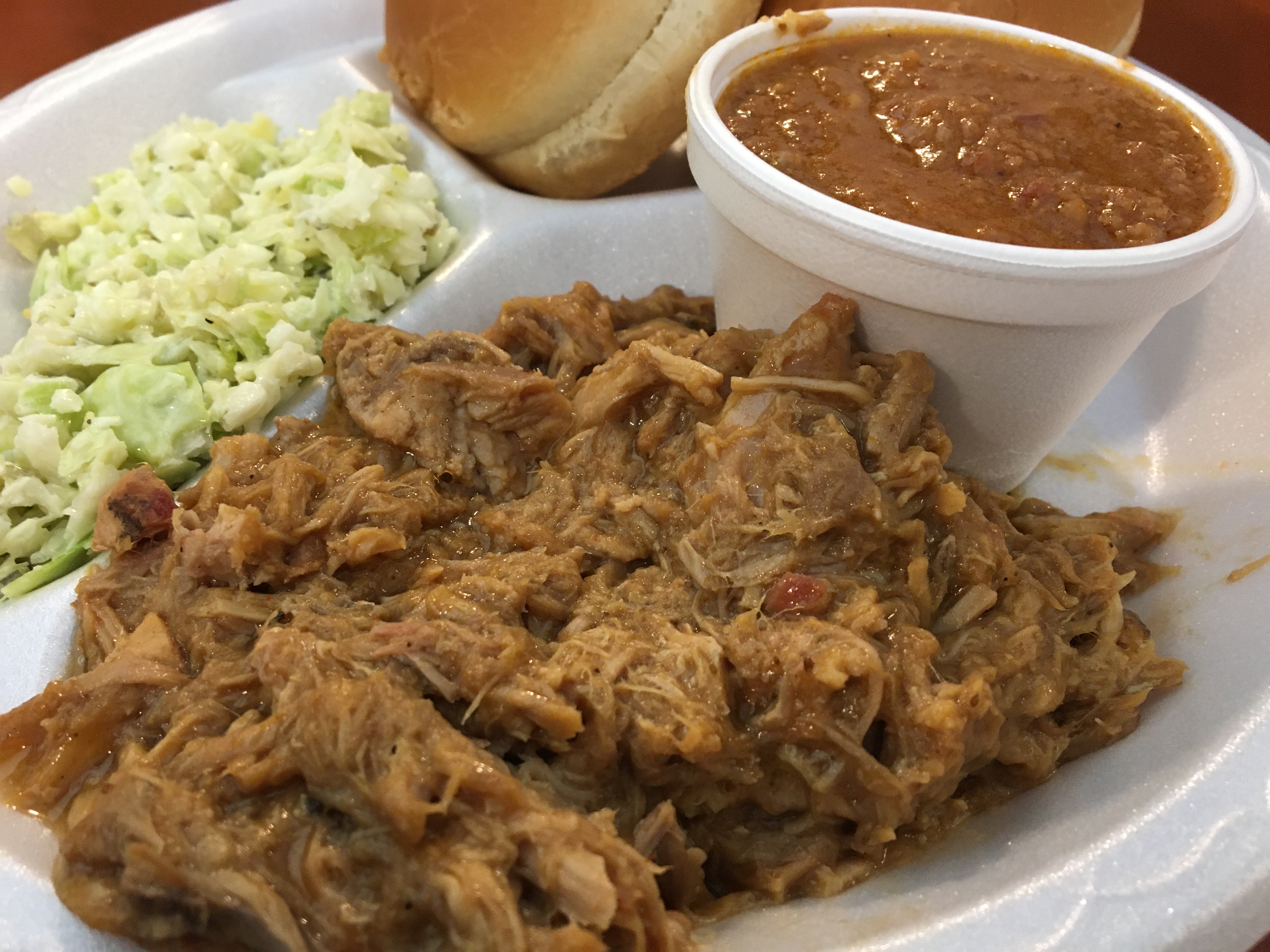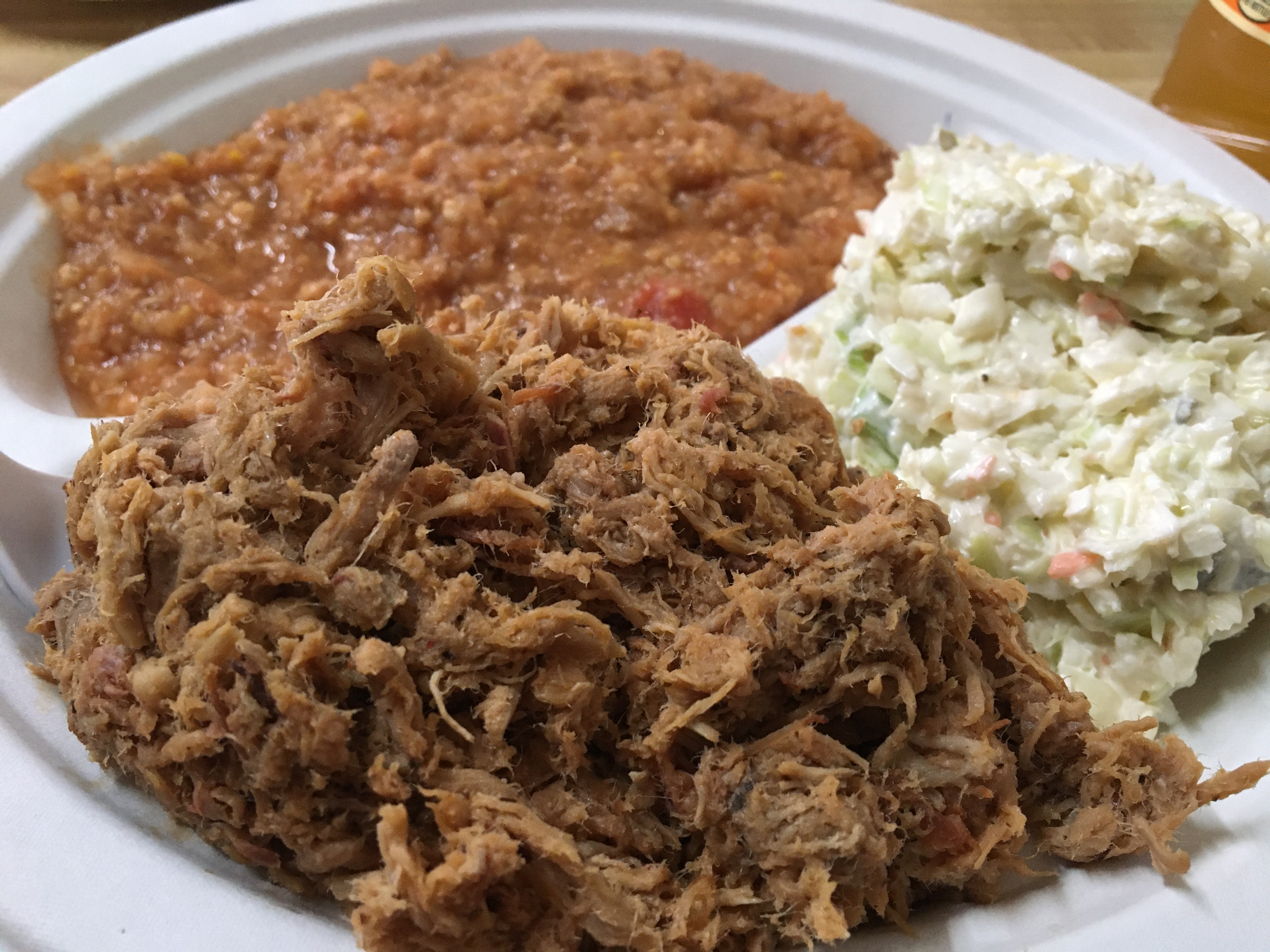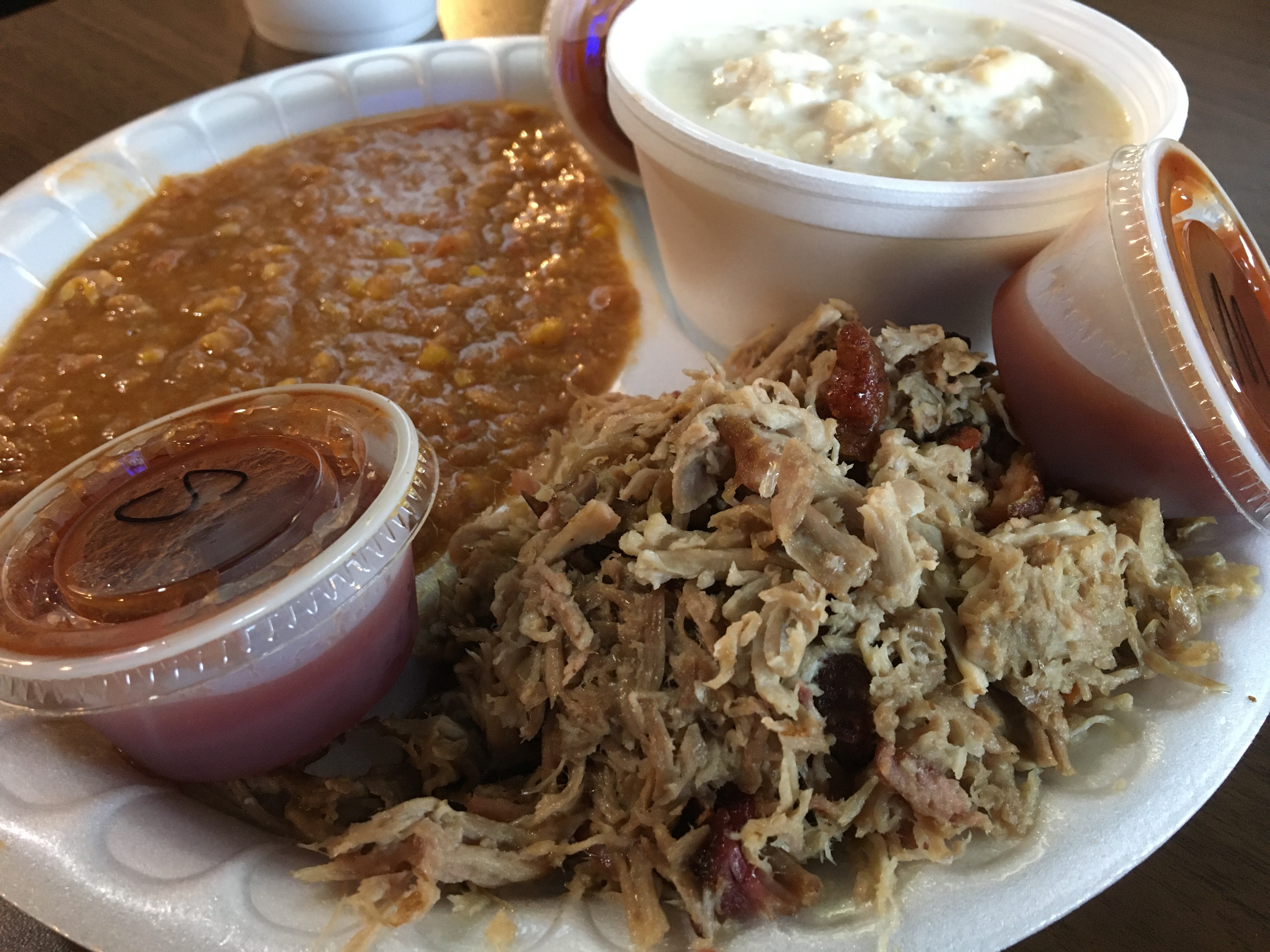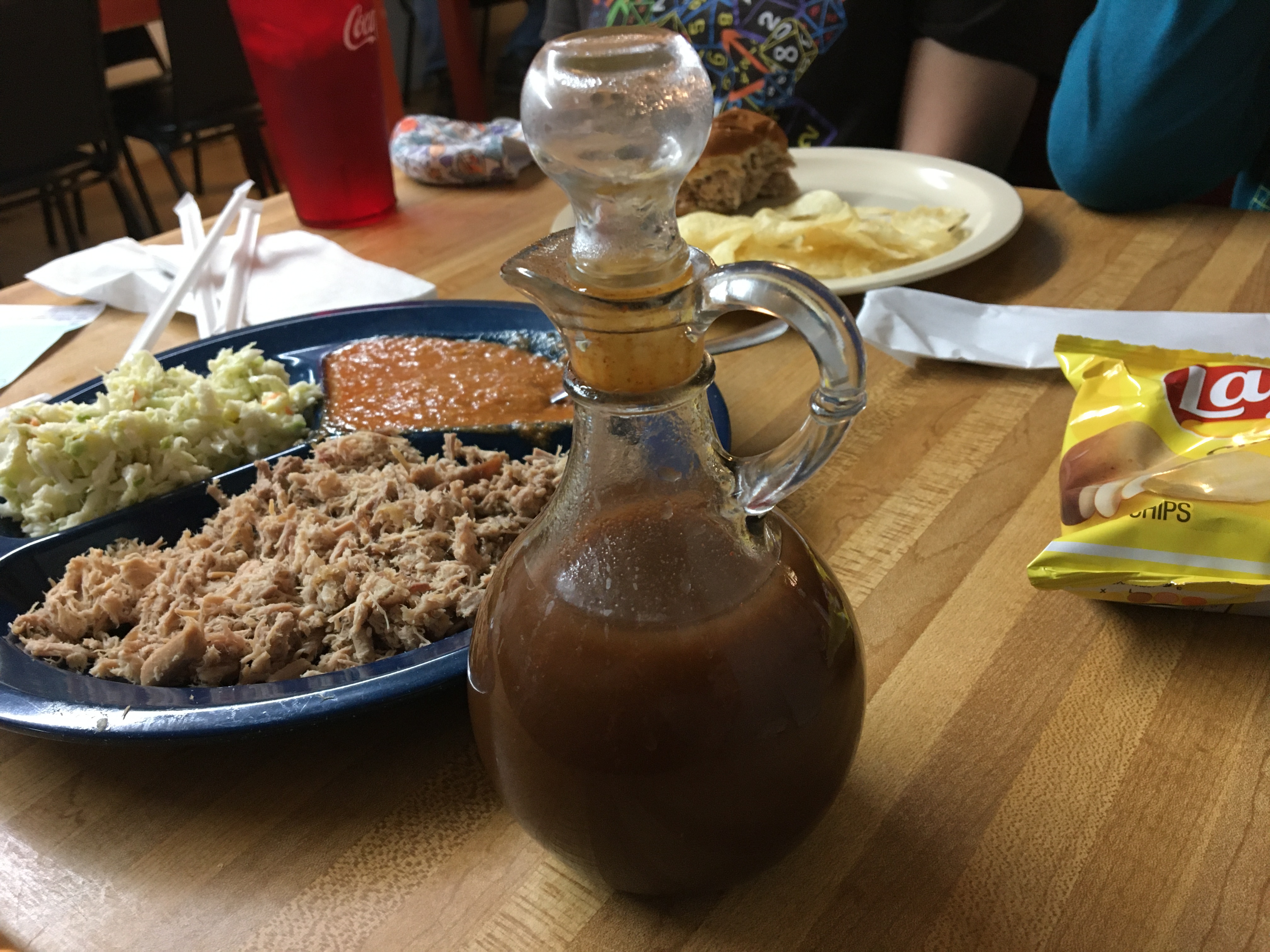 My family waited patiently for me, and then we drove into Athens for them to eat. The Butt Hutt is the newest restaurant we visited, about twelve years young, and it’s grown into a standard sit-down place with lots of servers, multiple sauces for different tastes, and a liquor license. The pork here is good, a little dry but smoky, but the star is chicken mull, which a few restaurants – not many! – in this region offer as a side. Hot Thomas had been one, unfortunately.
