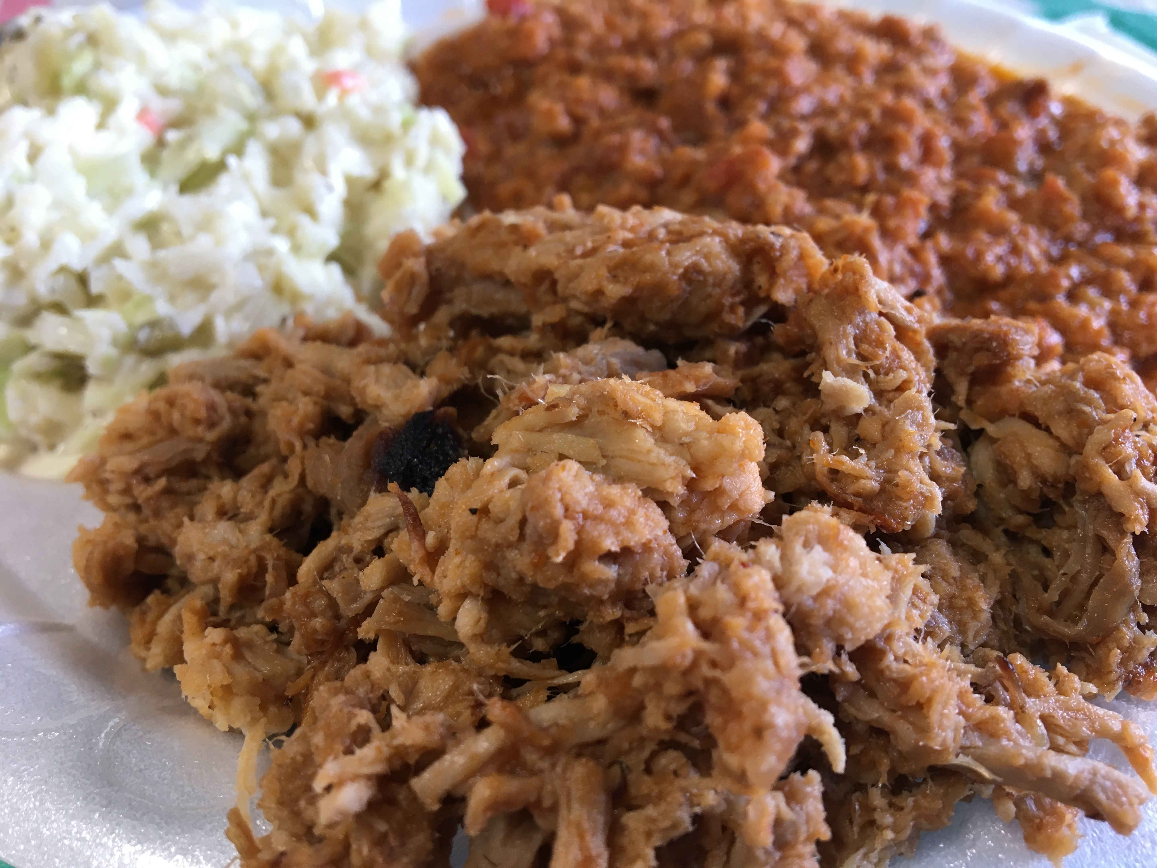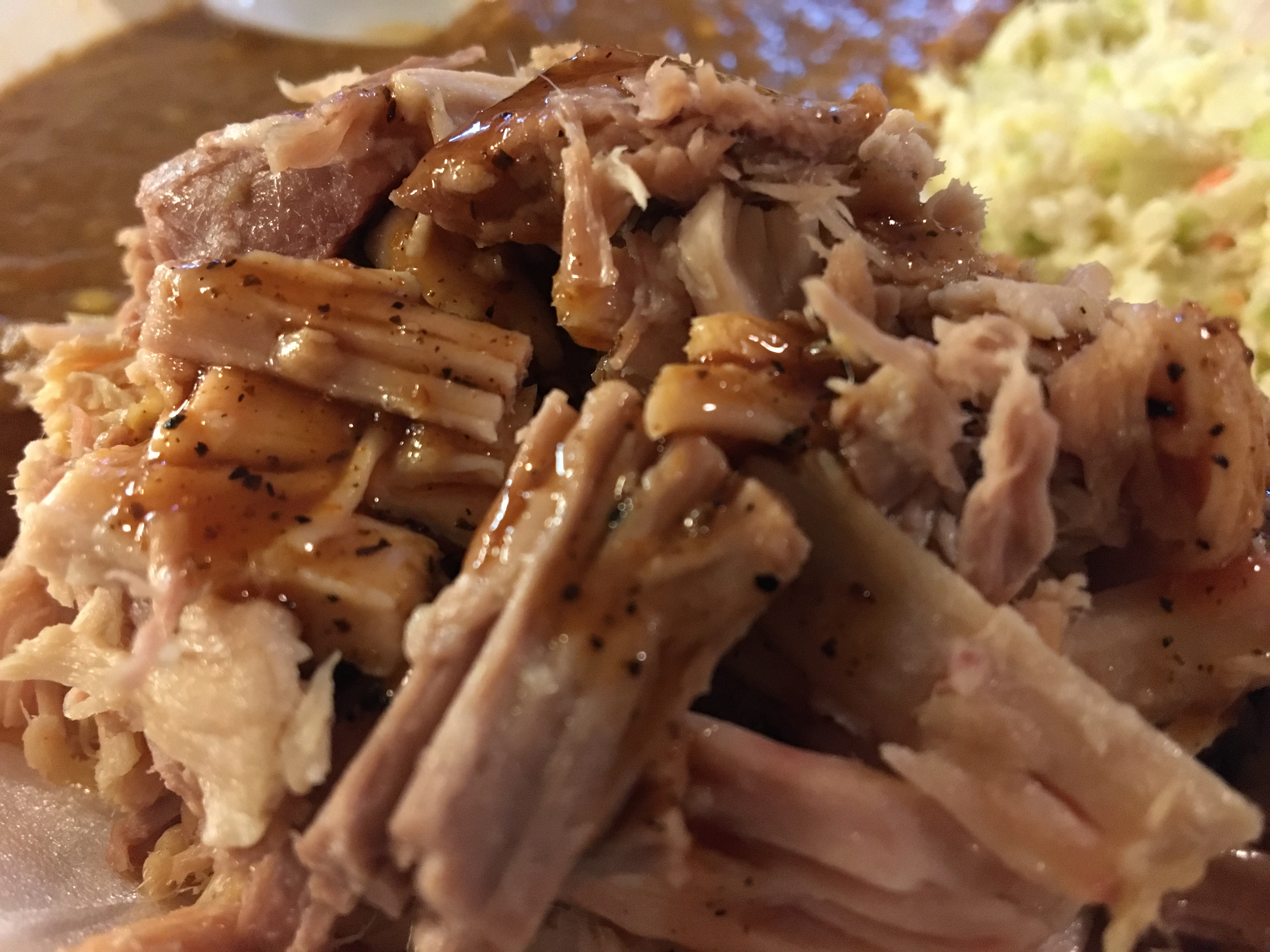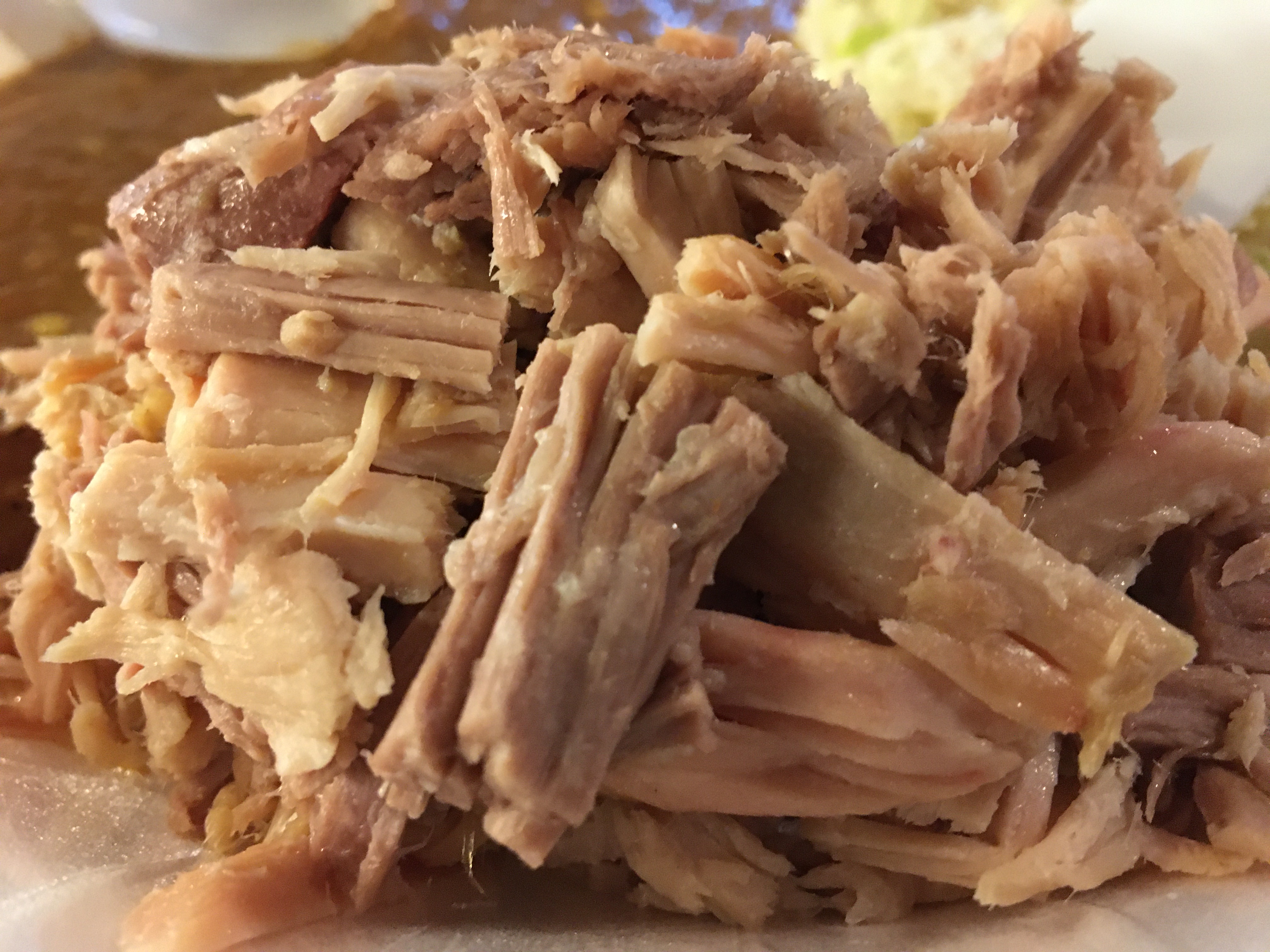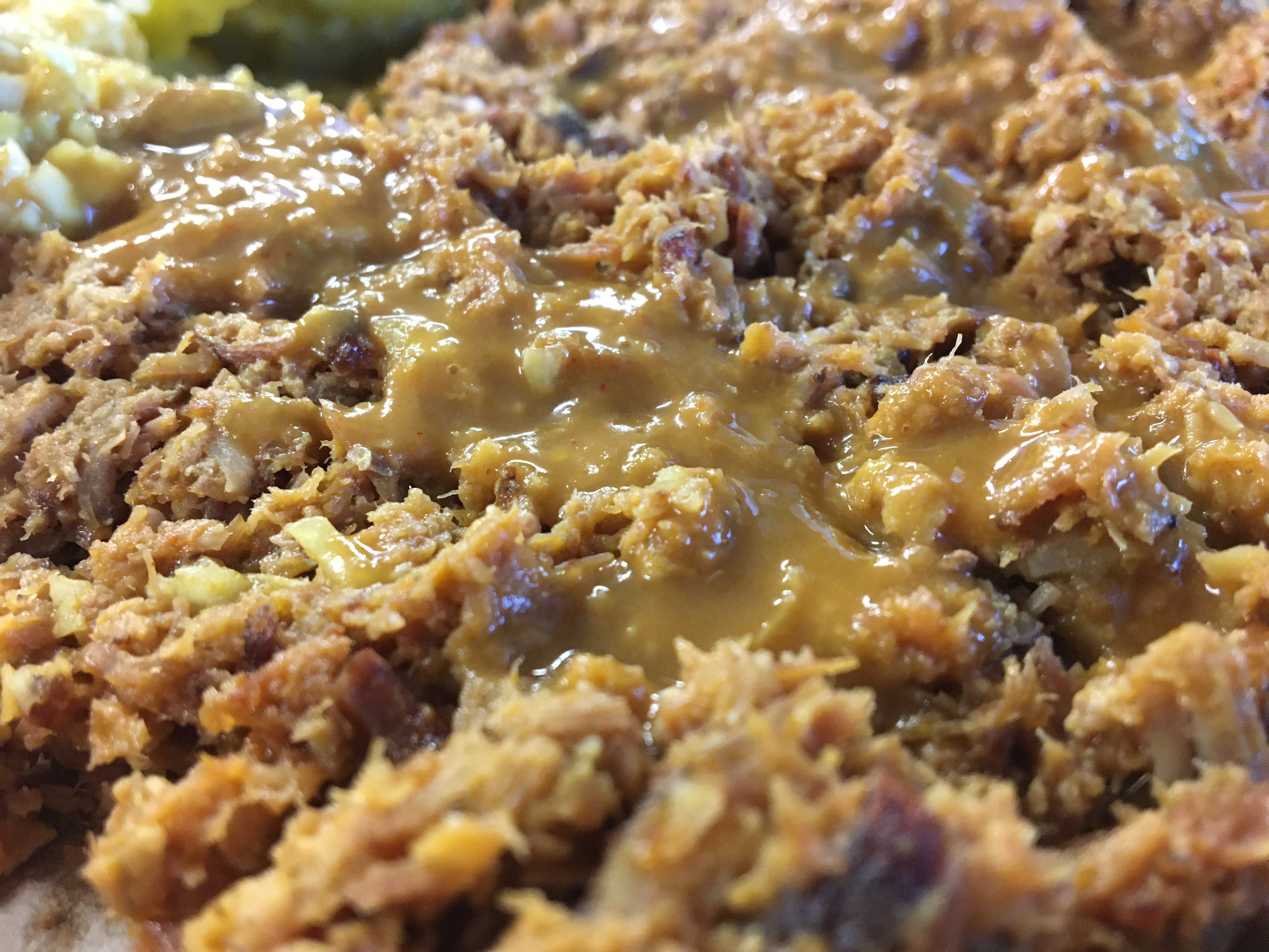 And chipped pork looks like this. It’s very finely shredded and the brown-orange sauce is poured over the top. Add mustard slaw and pickles for a fine meal.