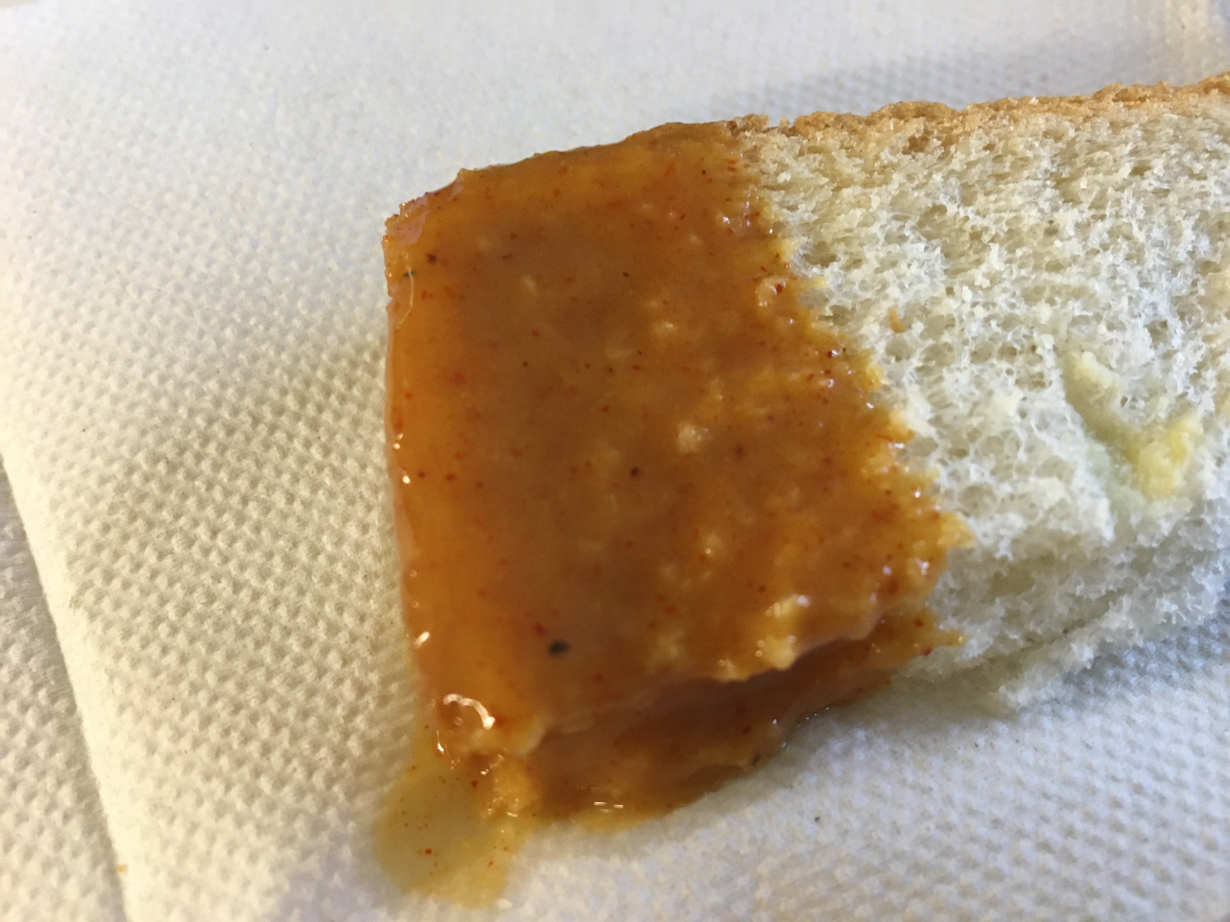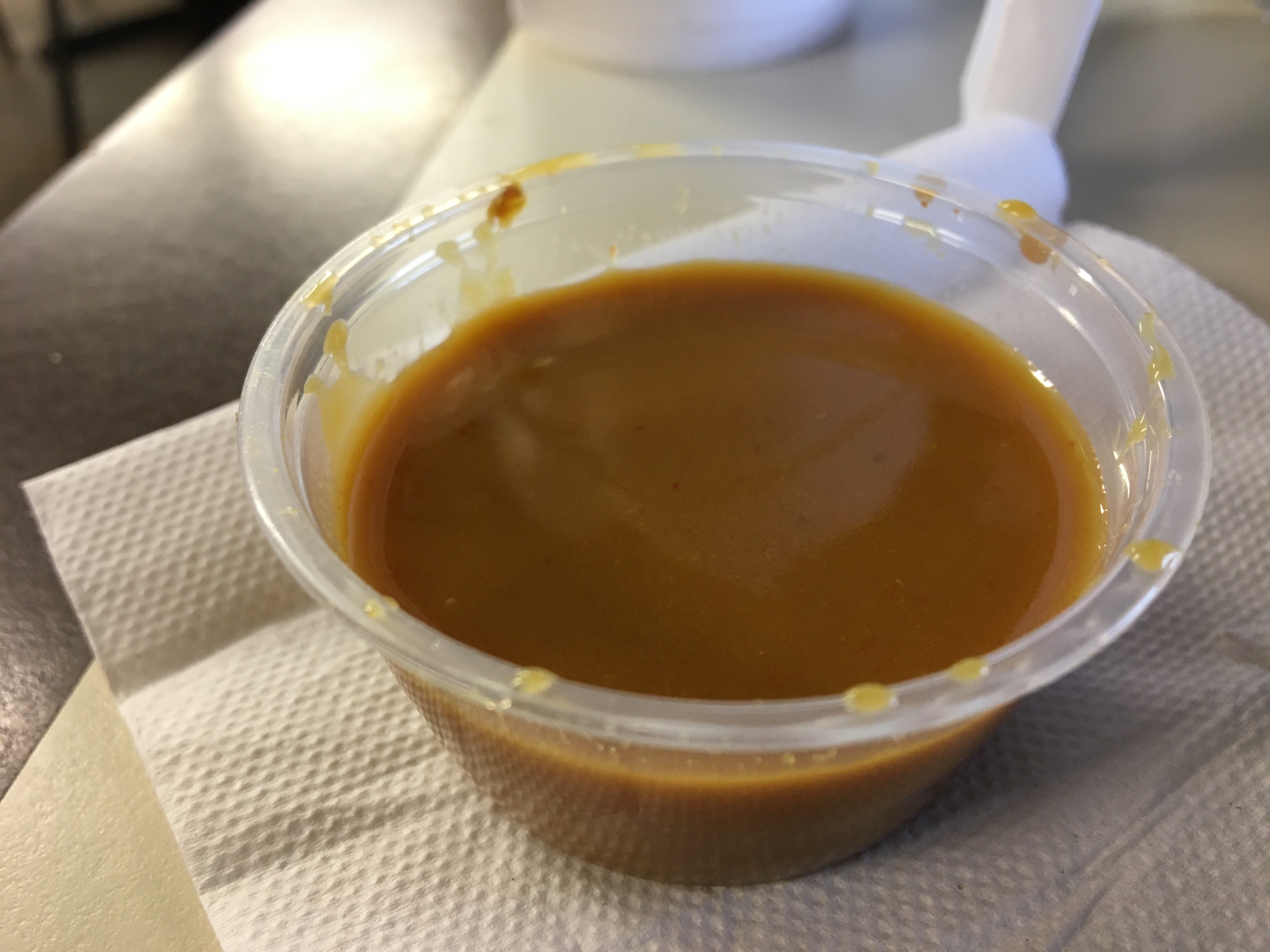 And this is the restaurant’s take on Chicken Comer mustard sauce, also known here and there as cayenne mustard or (by me) as crazy hot lava death mustard. Its range stretches north through Carrollton, Atlanta’s western suburbs, and up to Kennesaw. This is *amazingly* hot. Typically, Chicken Comer mustard is a little yellower than this.