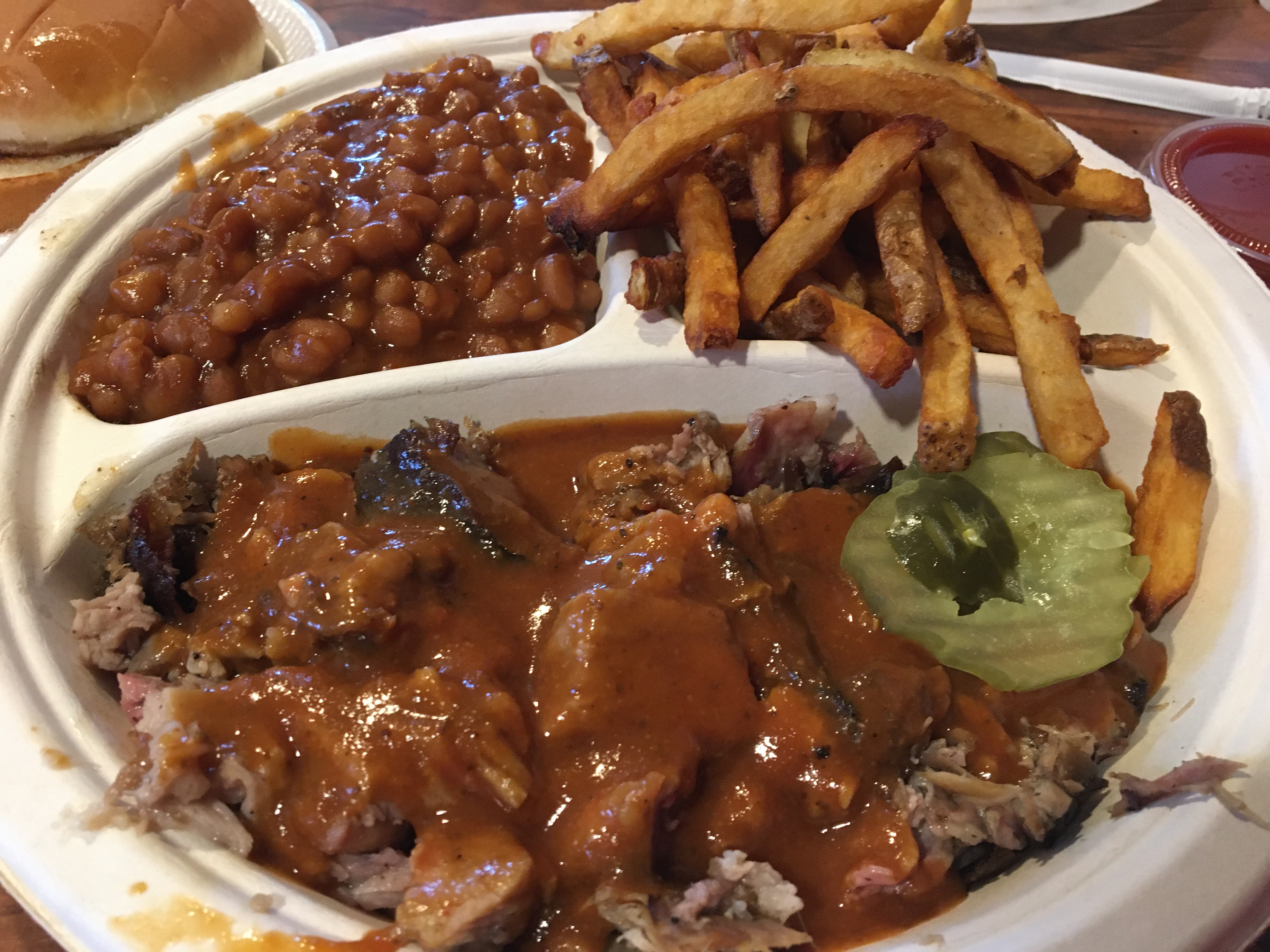 I won’t say these weren’t a little tempting, but we wanted to try the barbecue. It’s served drowned with the “original” of Carlile’s three sauces: a mustard-vinegar sauce that is similar to what I’ve seen in many Alabama places. I had mine with beans and fries, as this is said to be the classic combo here and really enjoyed it. Honestly, I should have ordered it dry and tried each of the sauces separately; while I certainly enjoyed this, I feel the volume of sauce overwhelmed the flavor of smoke more than I’d have liked; a very good meal might have been even better with less sauce.