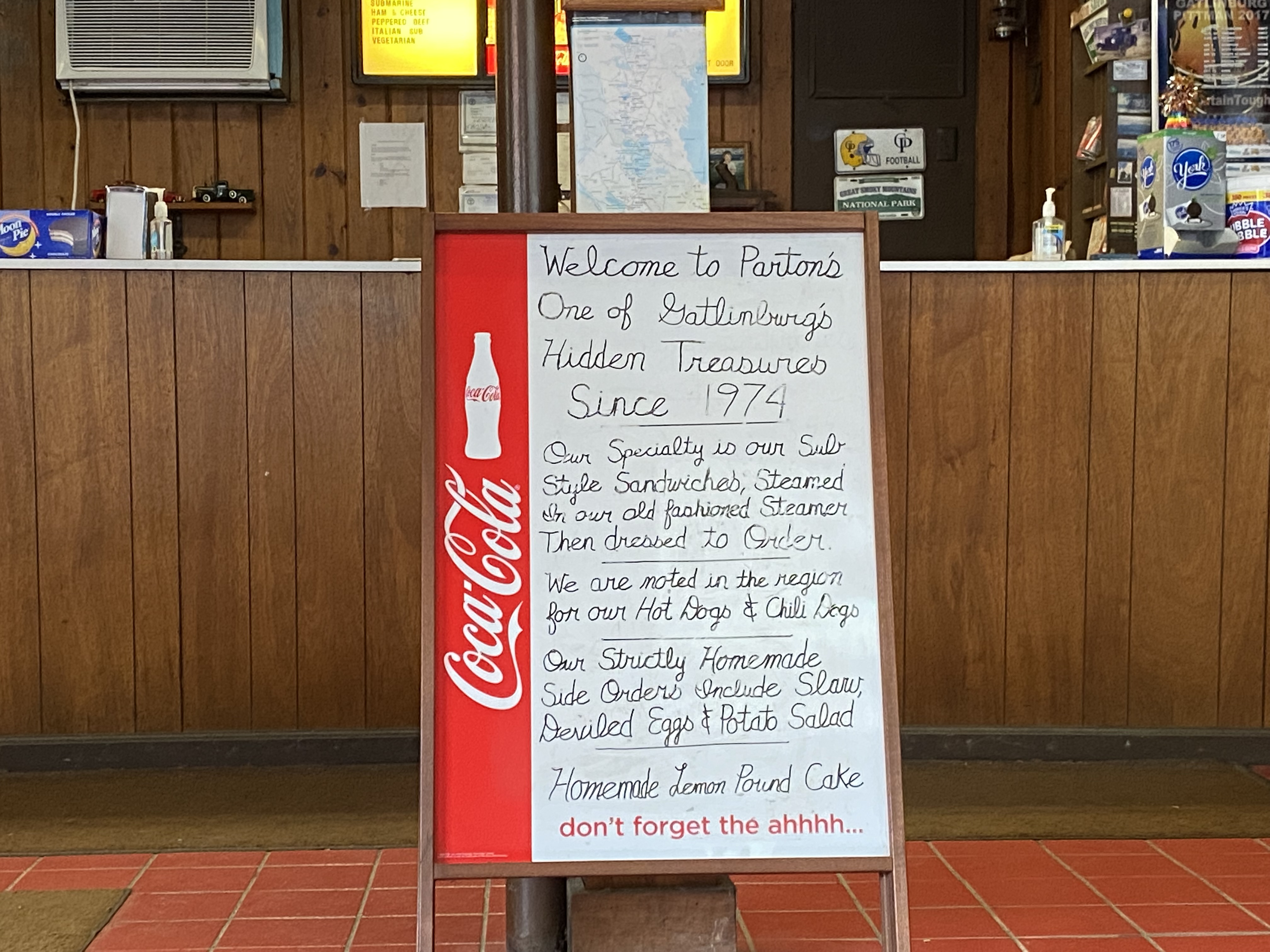 Parton’s won’t be here forever. It’s been here 48 years, an eternity in restaurant time, but this little oasis will most likely shutter when Dennis retires. There’s little of old Gatlinburg left. Our hotel, a good, bracing walk of a mile and a half away, seems to have been built around the time that the deli opened. I’m sure it was a fine hotel in its day, but five decades of humidity from the indoor pool have done a number on all the doors. Nothing closes flush in the entire building as far as we can tell.
